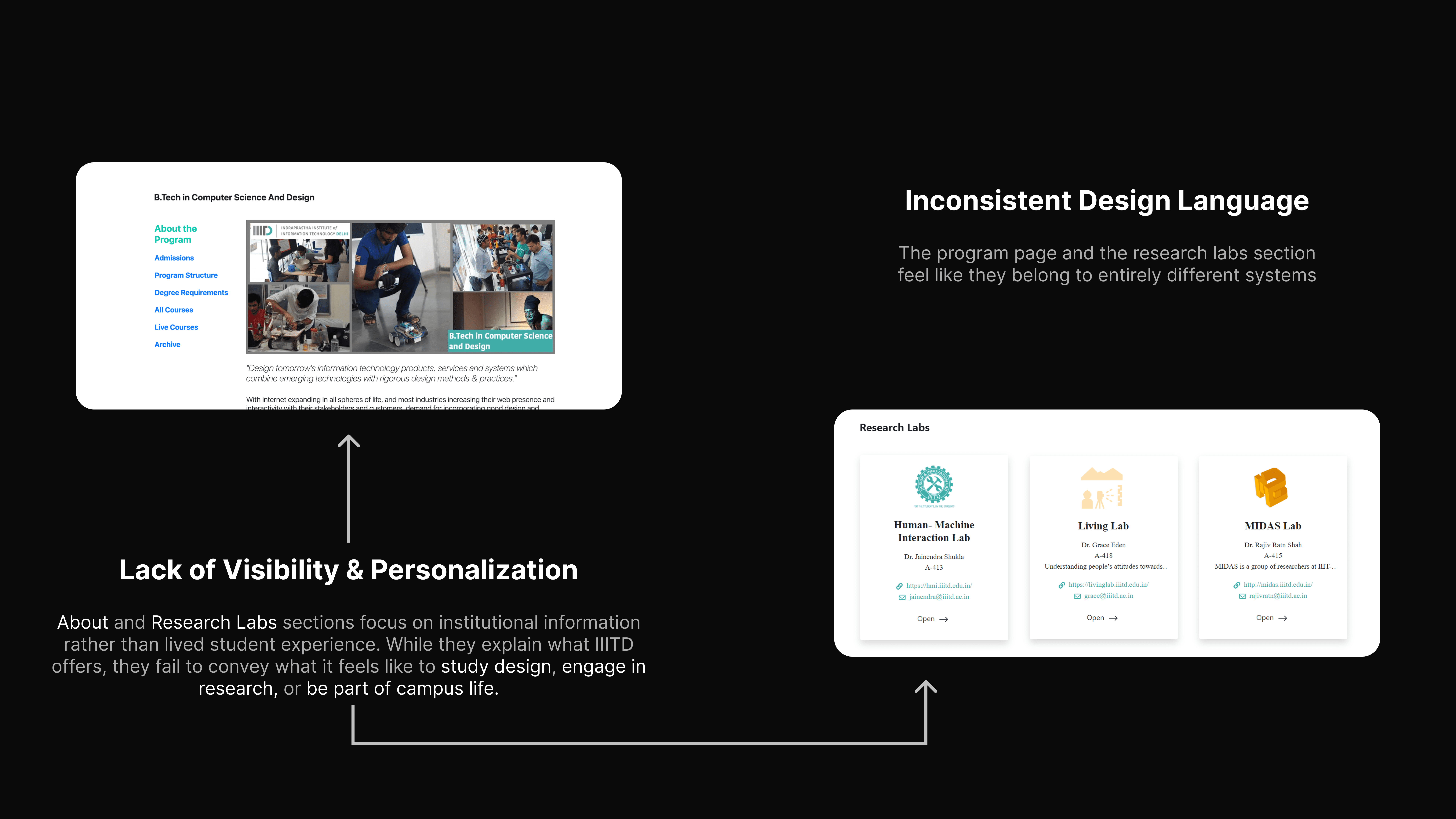 I was hired by the Human Centred Design (HCD) Department at IIIT Delhi to redesign their official website. The existing website was outdated, incomplete, and failed to clearly represent the department’s strengths and ongoing work. It lacked a compelling connection to potential recruiters, students, and external collaborators limiting engagement and outreach.